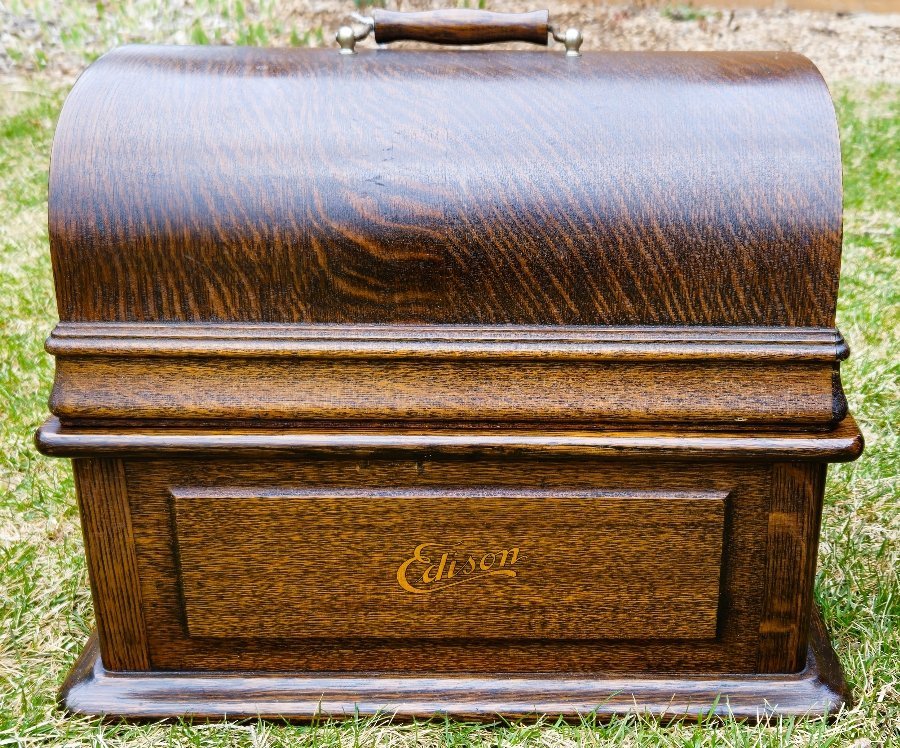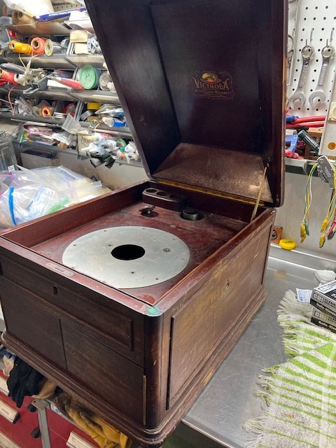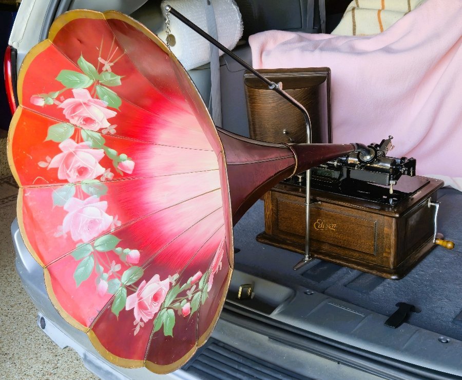 Bringing several machines to the show: An exceptionally nice and well equipped Edison Triumph Model B, with 2/4 Min. conversion, a shaver, and “D” repeater attachment. This machine is exceptionally clean, in excellent mechanical condition. The cover even has its original shipping blocks. It is sold with an original crane and beautiful red flowered horn. Price $1450.00 Also, a Victor Junior with a hard to find red petal horn. The machine is in good condition and runs well. The original reproducer is in very good condition and plays well. The underside of the cabinet has its original patent label dated February 1, 1908, along with a label showing motor lubrication points. Price $1200.00 Also bringing another Victor Junior with a repainted black cone horn. The machine is clean and runs well with an excellent reproducer. Price $675.00 Hope to see you there! Robin & Joan