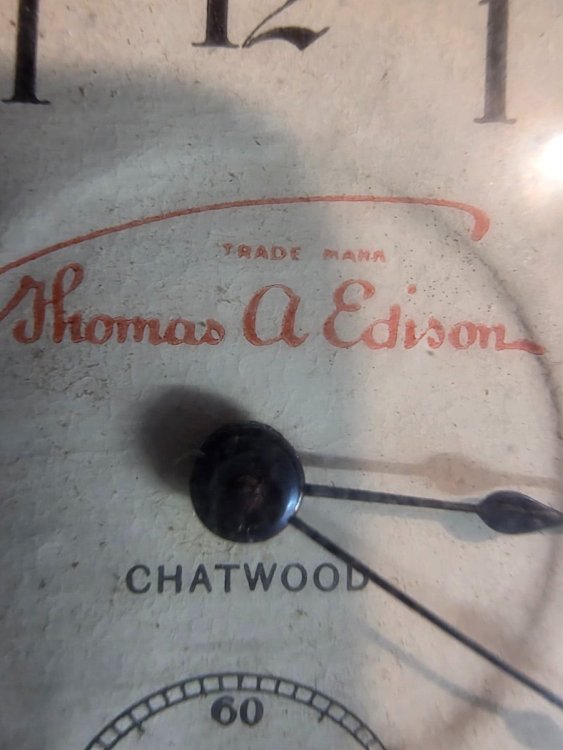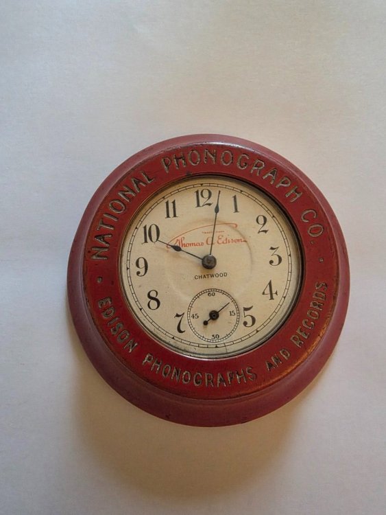 Rod, Please show a photo of the back of the clock and a sharp close-up of the Edison logo Have you ever opened it, to identify the movement and its markings? My searches have not found anything of use for "chatwood" plus ... antique clock edison novelty or novelties phonograph or phono music dealer advertising talking machine ... or with smaller businesses that may also carry phonograph jeweler optician chemist druggist James. -