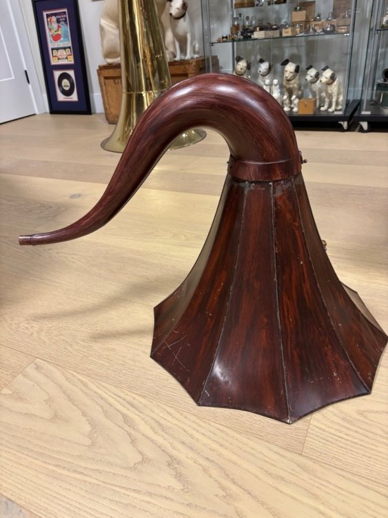 Here is the process I used to match the original mahogany wood graining finish on and Edison Cygnet bell as the one I have is missing the matching elbow. Before I go any further I would like to thank Greg at Phono Decals and Gary at Shenandoah Antique Restoration. Neither are taking on any more wood graining projects but both were generous enough to provide guidance and advice for my project 1. Started with a damaged beat up cygnet horn elbow 2. Stripped remaining paint, pressed out the dents and sanded smooth 3. Sprayed on a base coat closest to the original undercoat that I could find; Rust-oleum Nutmeg 4. Sprayed on a layer of Shellac (I had to protect the undercoat because the stain I used stripped off the first coat when I applied it to the elbow) 5. Brushed on a thin layer of Mahogany (red colored) wiping stain. I chose this stain because I had it available on my shelf from previous projects. I applied the stain with a $ 1 paint brush and pulled off the stain at the same time leaving a fine gain appearance like mahogany wood. 6. Sprayed another layer of Shellac 7. Brushed on Brown Mahogany wiping stain to give the appearance of darker wood grained areas. 8. Sprayed on Satin Lacquer ( I could have used a semi gloss finish as well but that was way was on my shelf) 9. Applied a layer of Renascence Wax to match the finish of the original bell. Although this process sounds complicated it actually was quite straightforward and the final result is very close to the original. I am sure that is because duplicating Mahogany wood grain is a lot simpler than the artistic skill required to duplicate the faux wood graining for Oak horns. Bruce