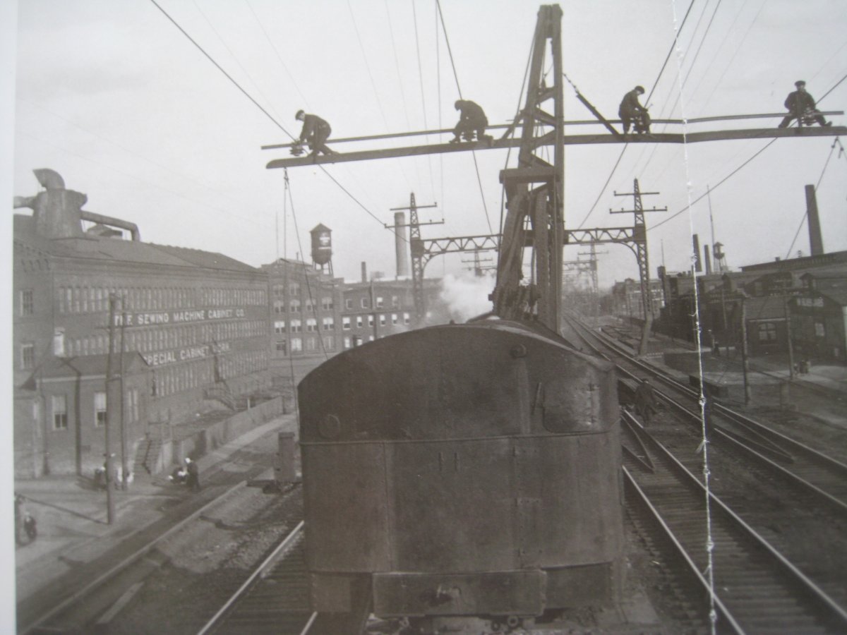 Thanks to everyone who posted all those great photos and provided information about the Columbia Grand machines! The picture below is something I found in a book about railroads in general. It is captioned "New York, New Haven & Hartford Railroad - Four men building catenary - Bridgeport Connecticut, 1914". The building to the left is identified as "THE SEWING MACHINE CABINET CO. " - "SPECIAL CABINET WORK". The building just beyond it I think might be the American Graphophone factory and the water tower has something painted on it that might be the Columbia Record logo. I know that the North American Phonograph Co. did business with the Sewing Machine Cabinet Co. and that the Graphophone factory building had been previously used to manufacture sewing machines so I think that all those great Columbia cabinets might have been made right in this building. Unfortunately, the photo has been prepared for printing purposes and as such has lost some clarity. I'm sure the original photograph would show the writing on the water tower much more clearly. Dan Zalewski -