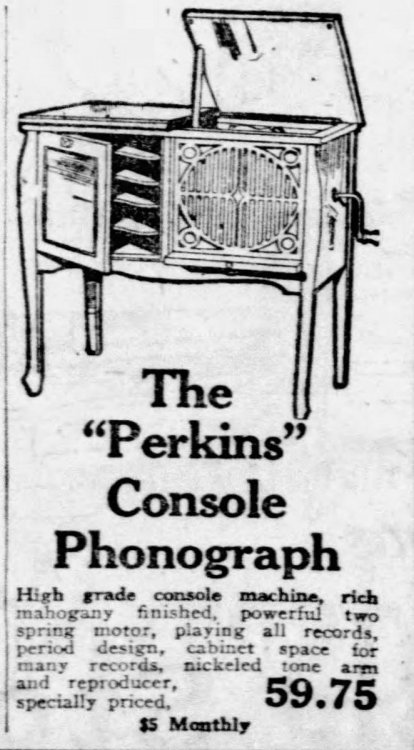 I'd recommend finding a more appropriate tonearm. Since it's not original and is too short, it will put excessive wear on your records. The Perkins Phonograph Company of Chicago was connected to Henry Saal, president of the H. G. Saal Company. They originally manufactured micrometer gauges, dies, and precision instruments before becoming a general metals manufacturer. By the 1910s, the phonograph market had exploded, and many companies wanted their own machines. The problem though, making one could be expensive, especially the metal parts, like the motor. Saal mass-produced generic phonograph motors for companies assembling their own machines. One of Saal’s biggest customers was Sears, for whom they supplied motors used in the Silvertone, Sears’ in-house phonograph brand. By the early 1920s, the market started to cool off due to oversaturation and the rise of early radio. Sears’ sales dropped, and they began selling off overstocked Silvertones to be rebranded, notably by the Beckwith Piano & Organ Company (a Sears supplier) under their Crown brand. Sears' orders from Saal likely dropped. Saal used the Perkins Phonograph Company to assemble their own machines, helping to dispose of overstock parts while also advertising them. Yours is a console model dating between 1923–1926, but without the original tonearm, it’s hard to narrow it down much further. -