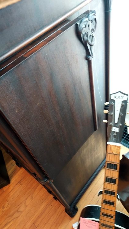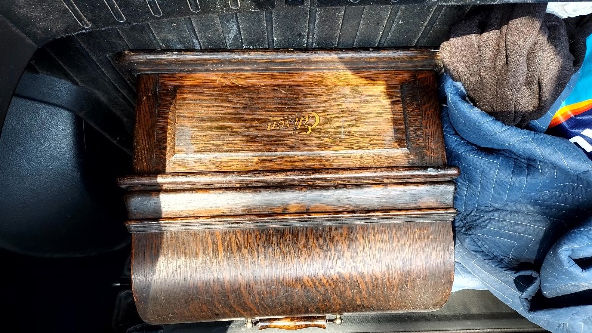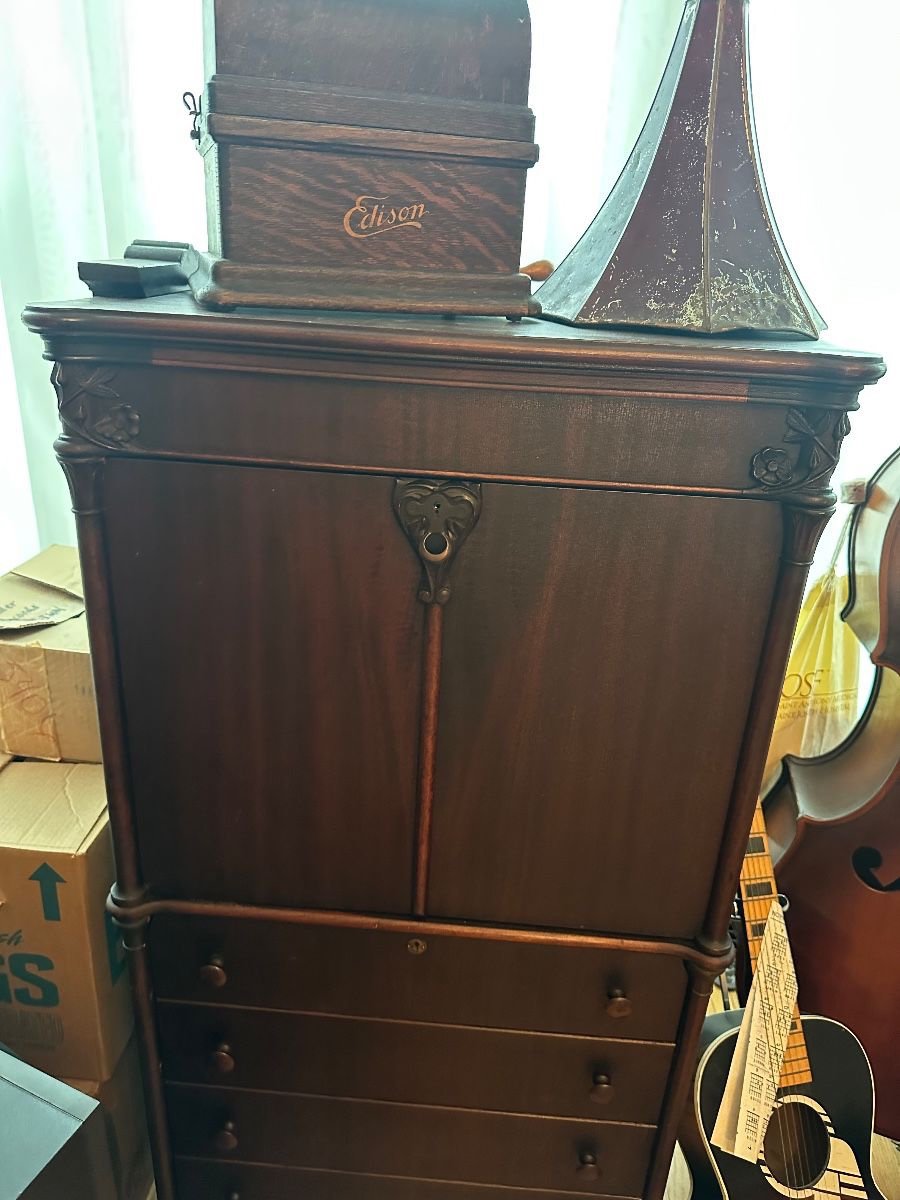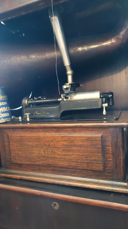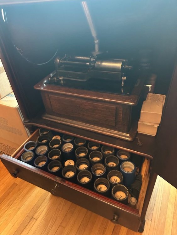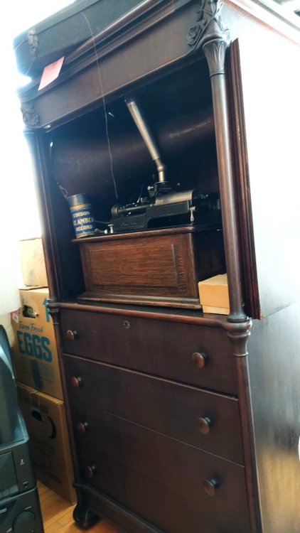 This appeared last week at a local estate sale. The asking price was $2900 OBO. I believe it finally went for $2300. It was a package deal including the Fireside sitting on top. Along with four boxes of cylinders. I only investigated the top box. I pulled out Blue Amberol #5044 with original lid. “Yes Sir, That’s My Baby”. After that I decided to not look any further. This was way too much for me to deal with. And also like others here, have run out of room! But I did come home with a neglected Edison Triumph #E plus a “Little Orphan Annie” lamp shade. The original owner was a prominent local. Involved with the fire department and other endeavors. It is nice to see stuff like this now and then. I really do think there’s still many interesting phonograph finds still out there.
