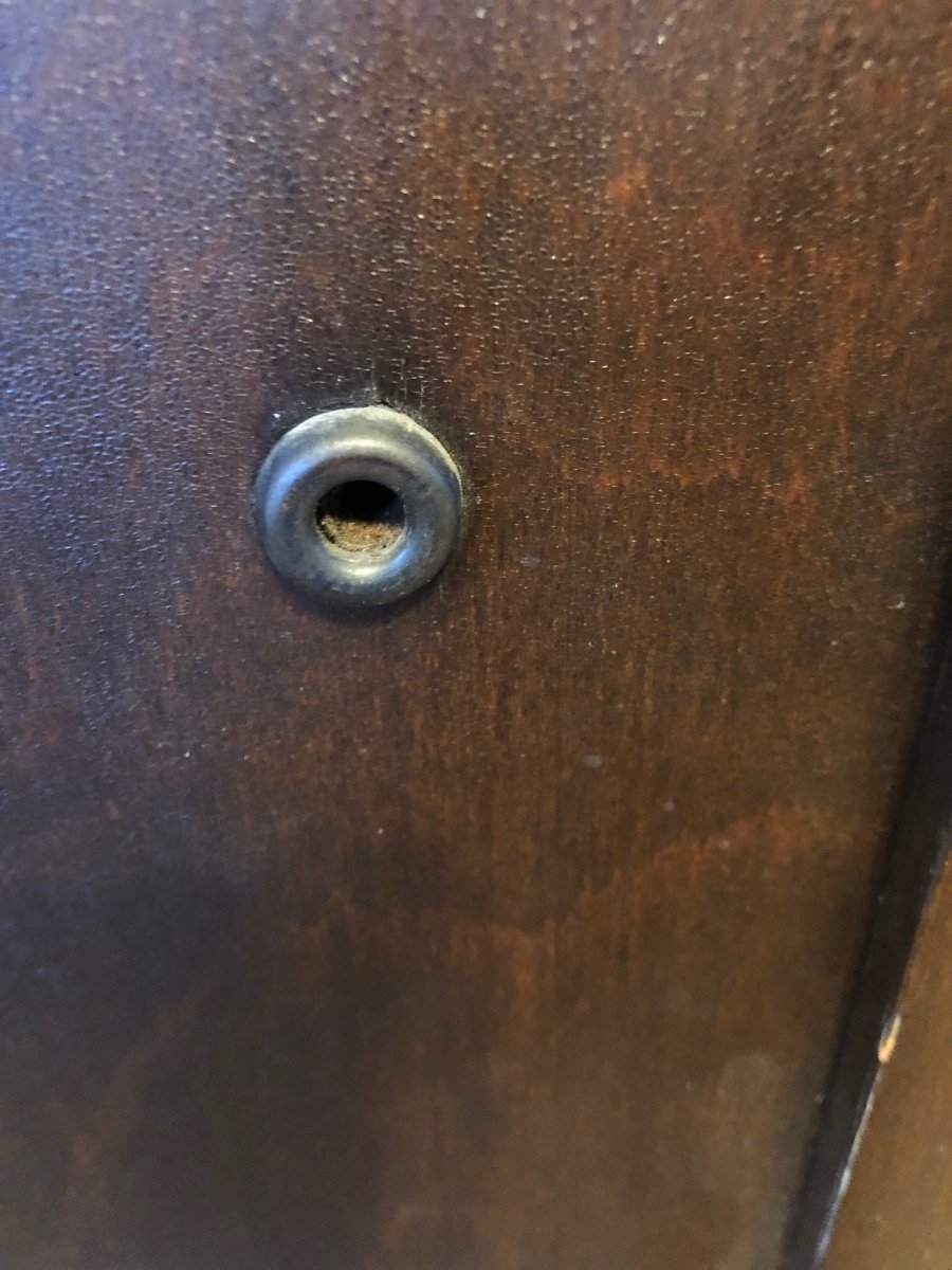 Dan Posted 10 hours ago Posted 10 hours ago Good morning I have another question about my Columbia Grafonola. I got a couple different answers to my first question about the cup like washers I found inside the machine . Know does anyone know what the purpose of these 2 grommets on the back of the machine . I think they’re brass ( at some type metal) with three prongs/claws . Any help would be great appreciated Dan